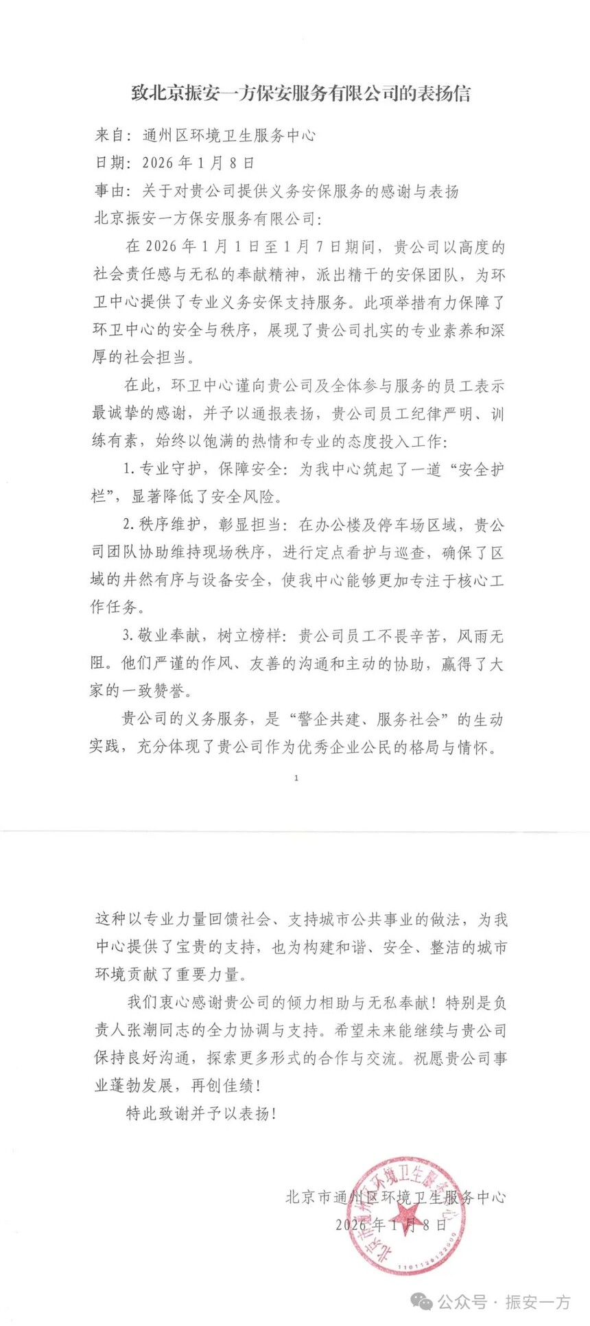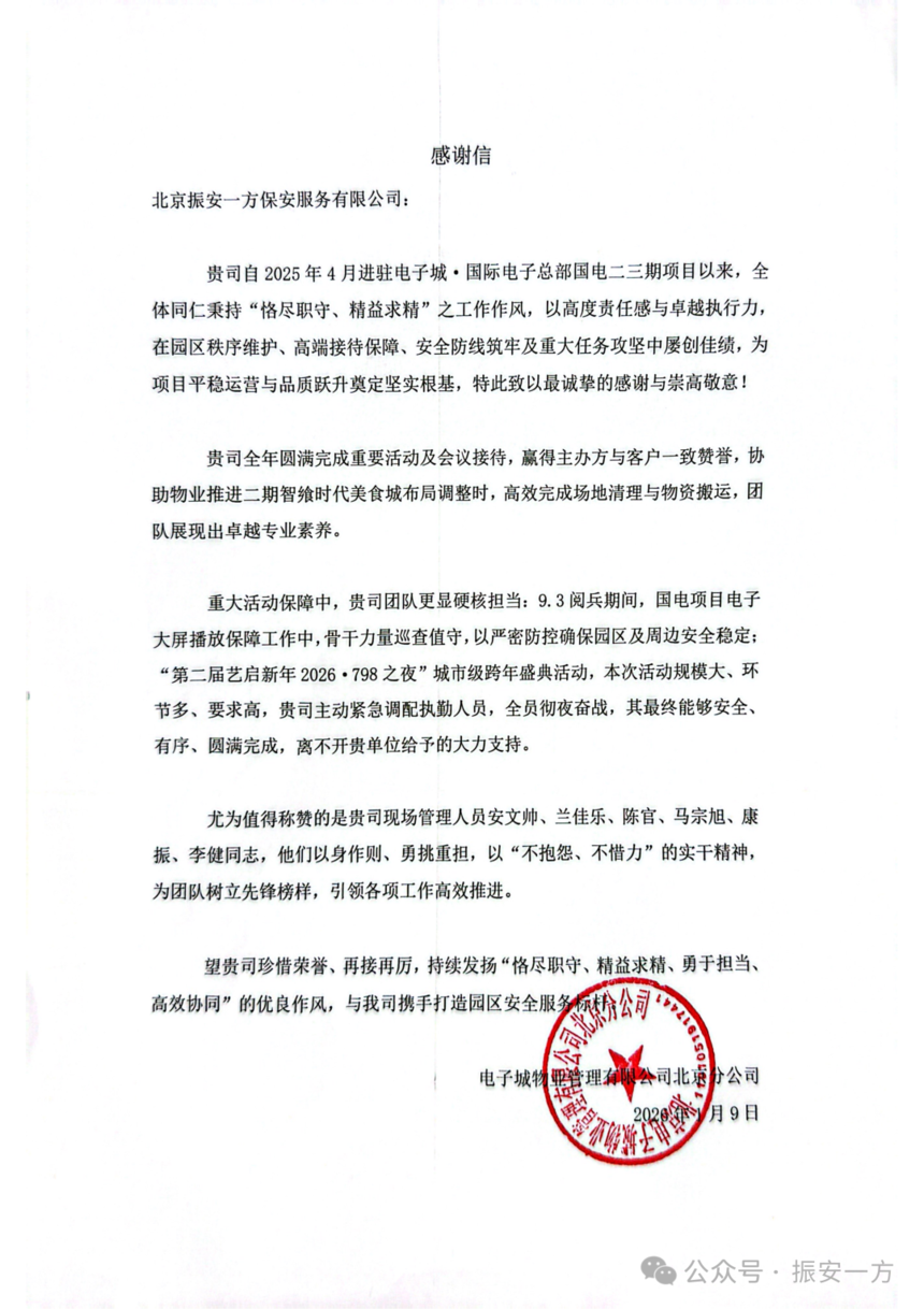 振安一方保安团队尽职履责获多家客户企业赞扬与认可近日,北京振安一方保安服务有限公司先后收到来自北京电子城国际电子总部和通州区环境卫生服务中心发来的感谢信,信中对公司驻点保安团队的出色表现给予了高度评价。